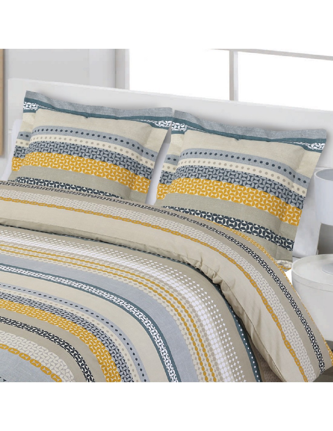 Cama 105: Funda nórdica de 180x240 cm y 1 Funda de cojín decorativo de 70x50 cm más volante de 5 cm alrededor.