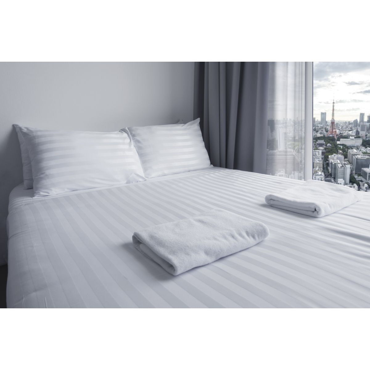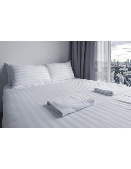 - Tejido Satén Percal 200 Hilos muy suave que combina rayas de 1,5 cm en blanco brillo y mate.
